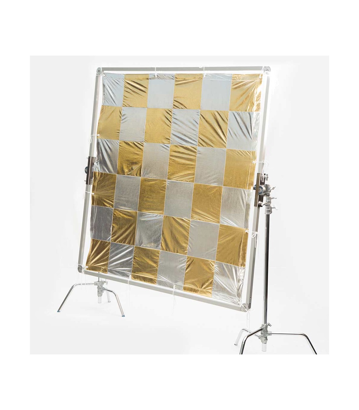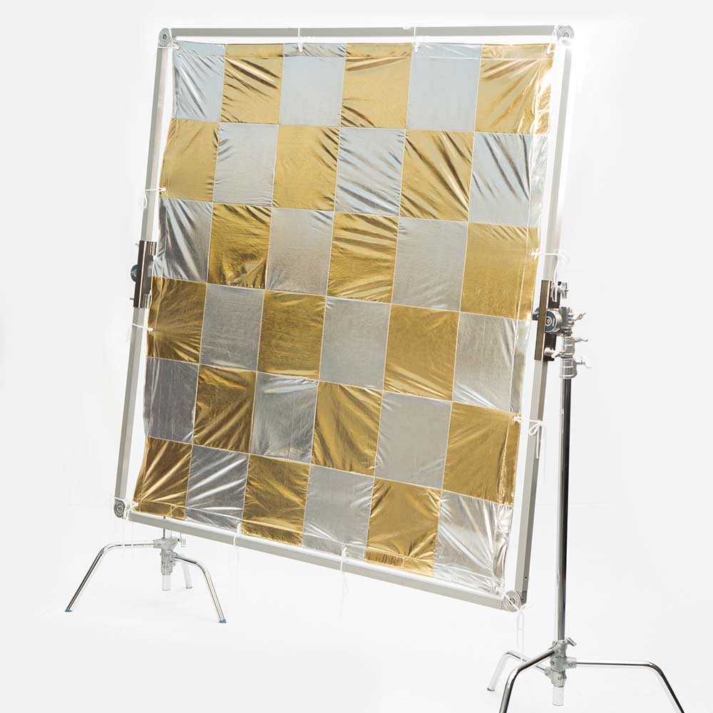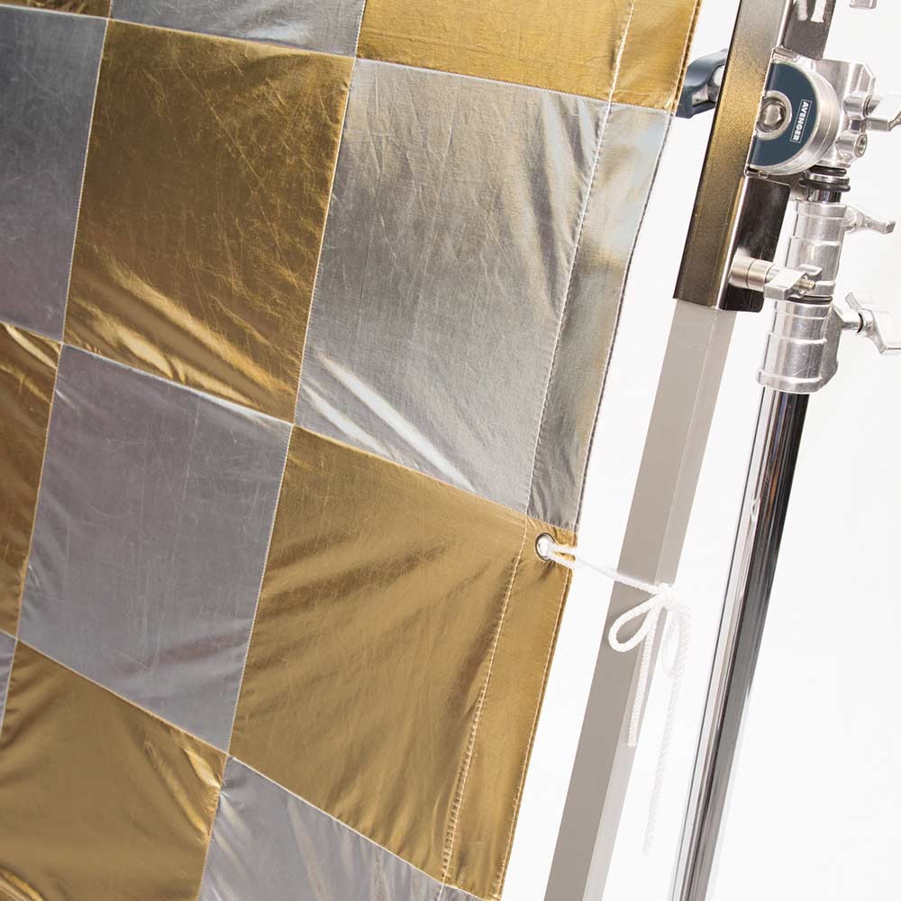 Textil para palio de 244x244cm (8x8') de Daylight. Reflector lamé a cuadros dorados y plateados. Conocida también como checkerboard o Elvis. Se utiliza como reflector suave con dominates cálidos desiguales. La tela de palio va reforzada por los cuatro lados y con ojales para las cintas de atar al palio; bolsa y cintas incluidos.