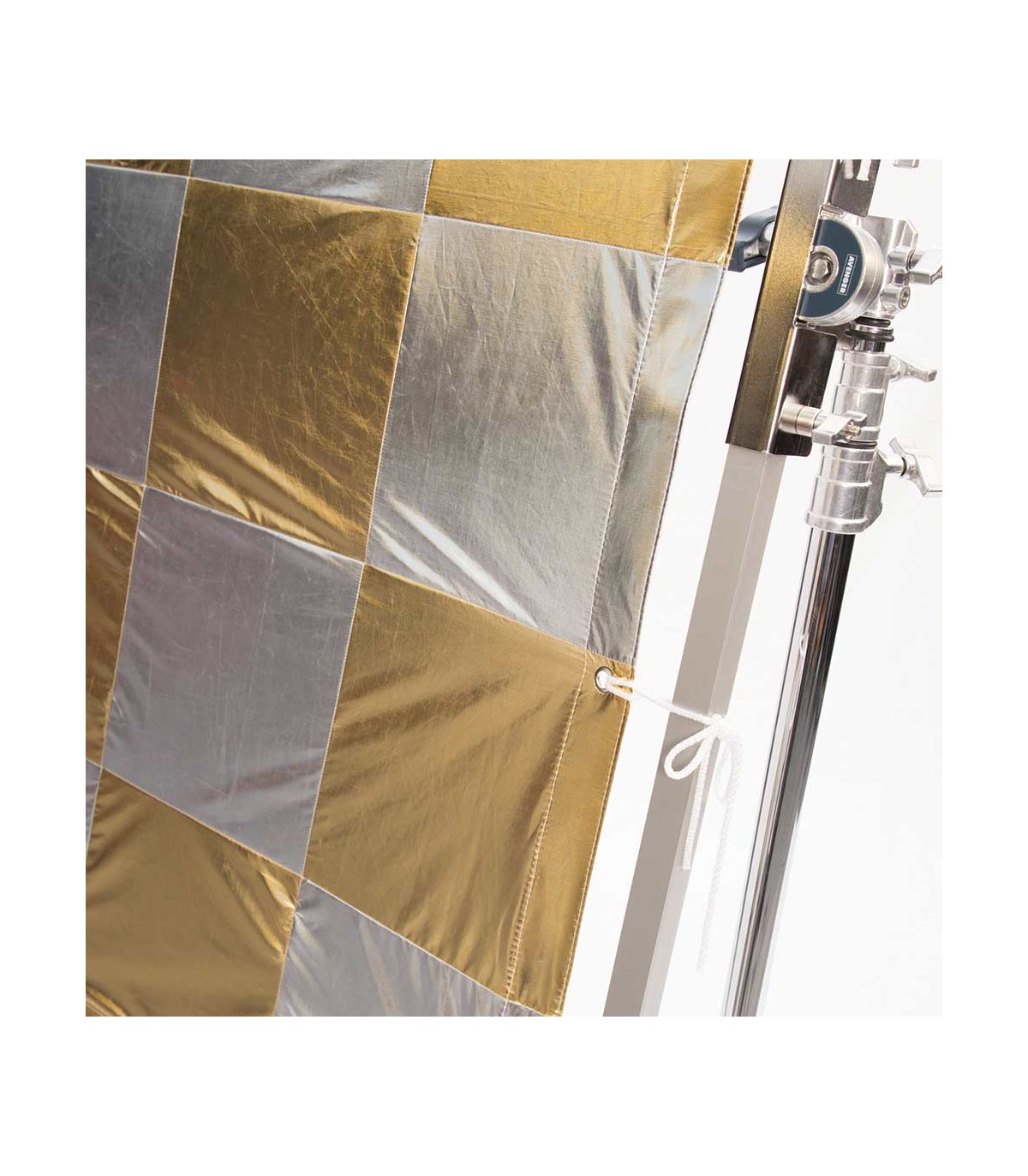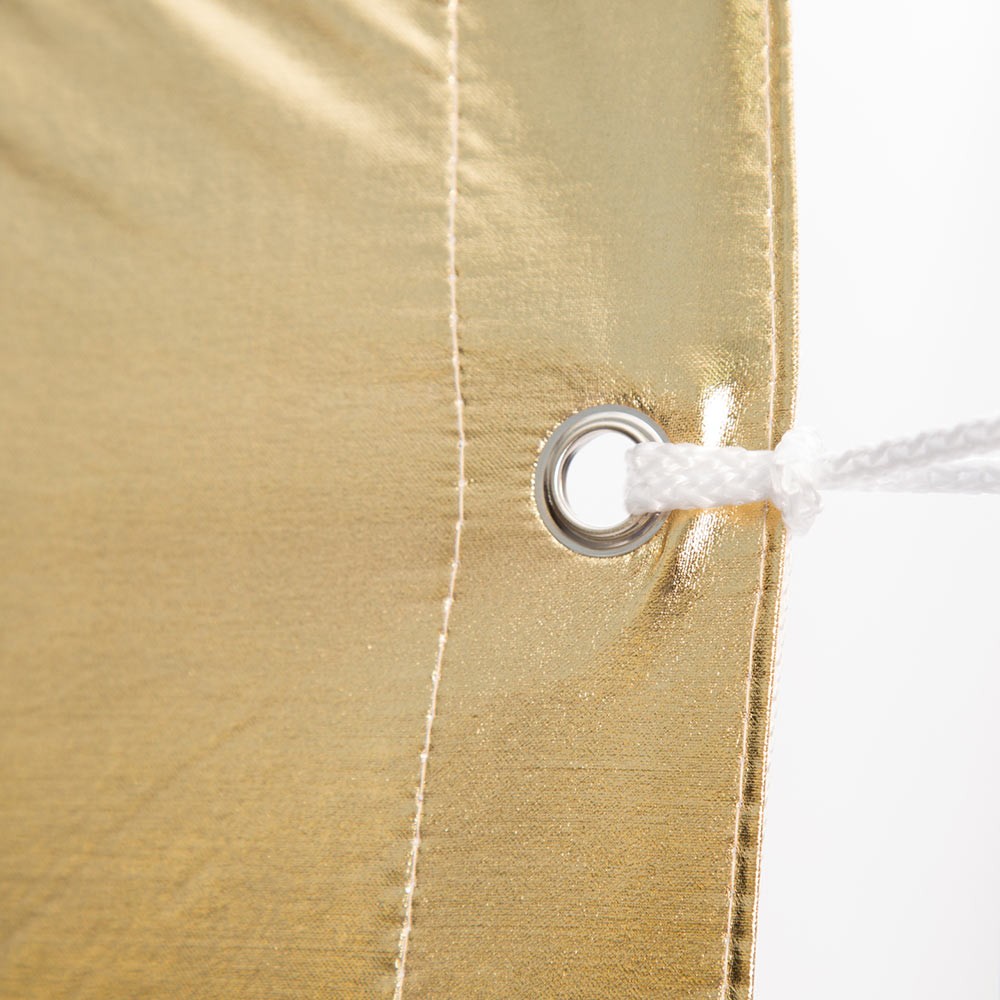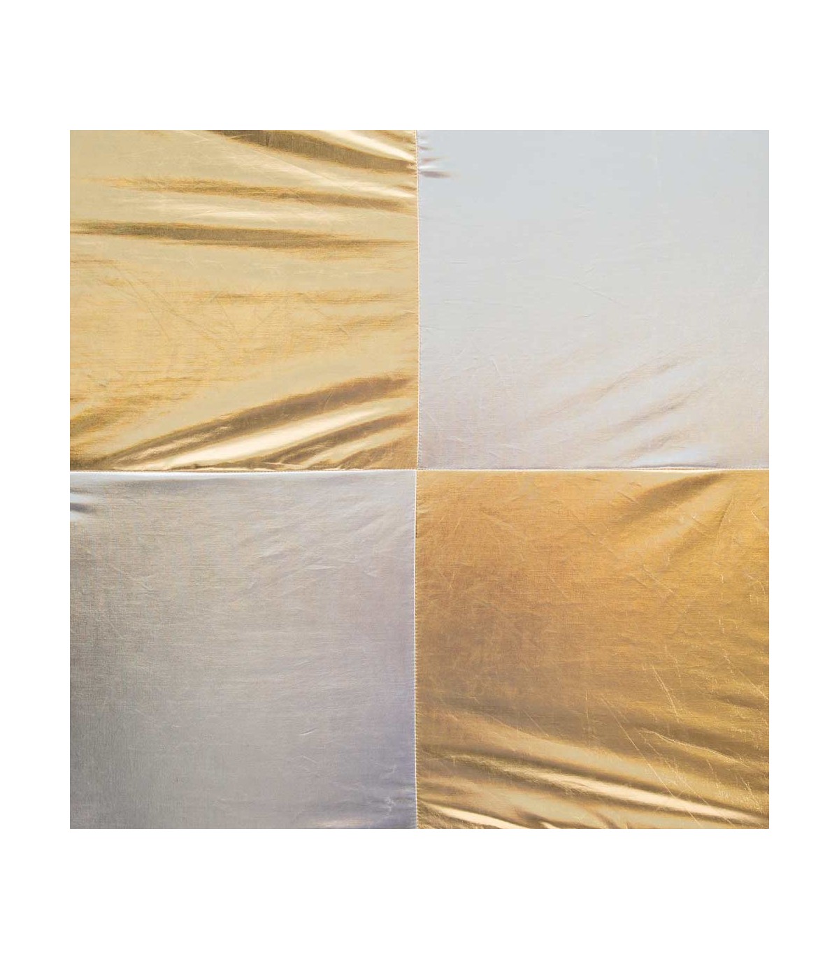 Textil para palio de 244x244cm (8x8') de Daylight. Reflector lamé a cuadros dorados y plateados. Conocida también como checkerboard o Elvis. Se utiliza como reflector suave con dominates cálidos desiguales. La tela de palio va reforzada por los cuatro lados y con ojales para las cintas de atar al palio; bolsa y cintas incluidos.
