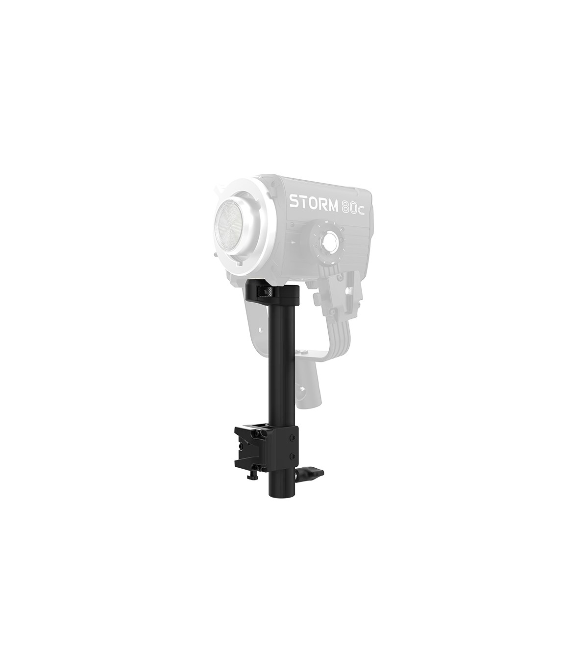 En su base hay una placa de batería V-Mount como contrapeso e incluye un cable de alimentación D-Tap a barril de CC de 5,5 mm para conectar la placa de la batería al STORM 80c. Las baterías USB-C también pueden alimentar el STORM 80c. Además, la parte inferior del soporte incluye un adaptador para montar el foco en otro soporte.