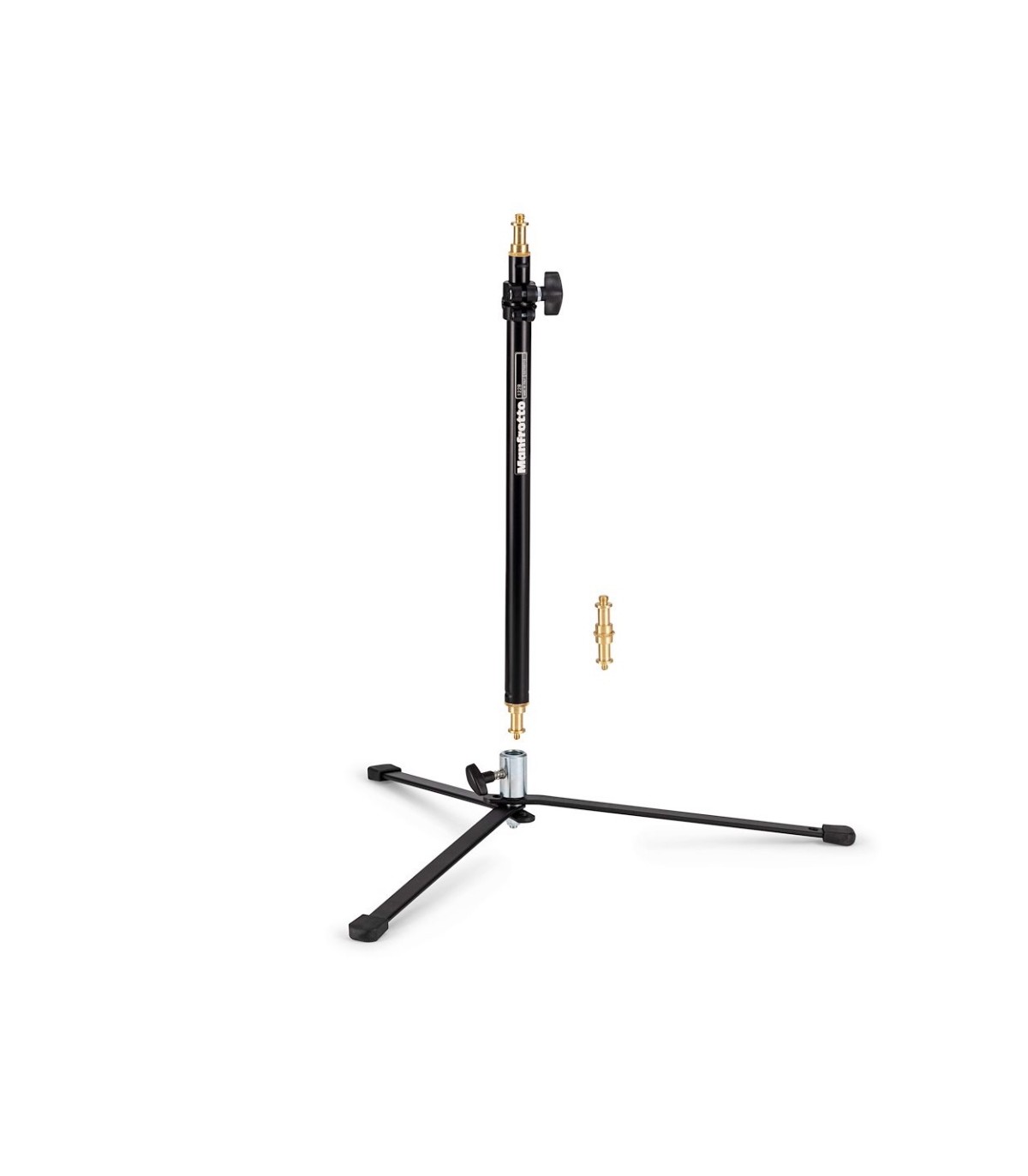 Base trípode Backlite de acero pintado en negro, con manguito 16mm, y columna aluminio negro con espárrago 16mm y espárrago 16mm. También conocido como trípode araña. máxima 85cm, mínima 9cm, plegado 48cm. Otras medidas: diámetro huella 60cm, capacidad 3kg, peso 1,32kg. Para montar proyectores pequeños a ras de suelo o a 85cm con la columna.