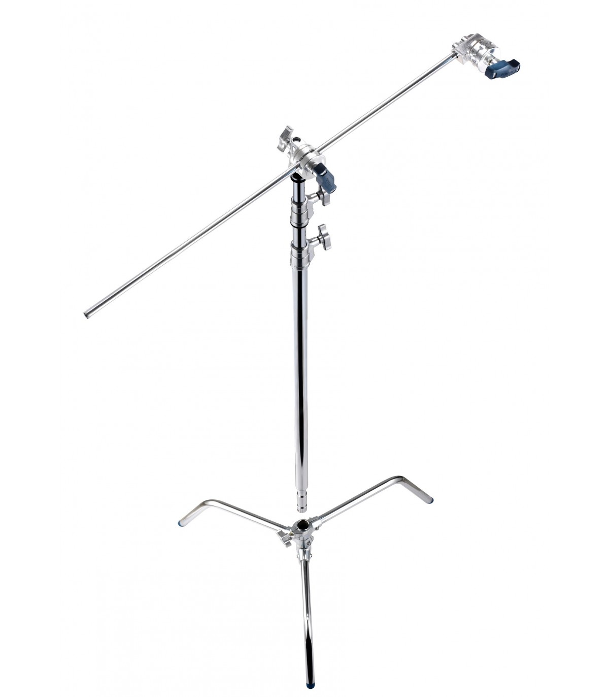 Kit trípode C-Stand 30 de acero cromado con base tortuga DESMONTABLE de Avenger. Base con manguito 29mm y columna con espárrago 16mm; incluye rótula ceferino D200 y extensión o espada ceferino de 100cm D520. También conocido como trípode Century o Ceferino. Trípode de 3 secciones (2 extensiones). Alturas: con columna máxima 300cm, mínima 134cm, sin columna 27cm, plegado 110cm. Otras medidas: diámetro huella 95cm, capacidad 10kg, peso 6,2kg. Avenger es la marca de referencia en la industria del cine. Este es el kit ceferino más popular para sujetar banderas y hollywoods; también sirve para focos pequeños en la columna y en la espada a modo jirafa, o un poco mayores en la base tortuga. *Se recomienda poner sacos de contrapeso en las patas de los trípodes cuando se trabaje con ceferinos y banderas o focos en un extremo.