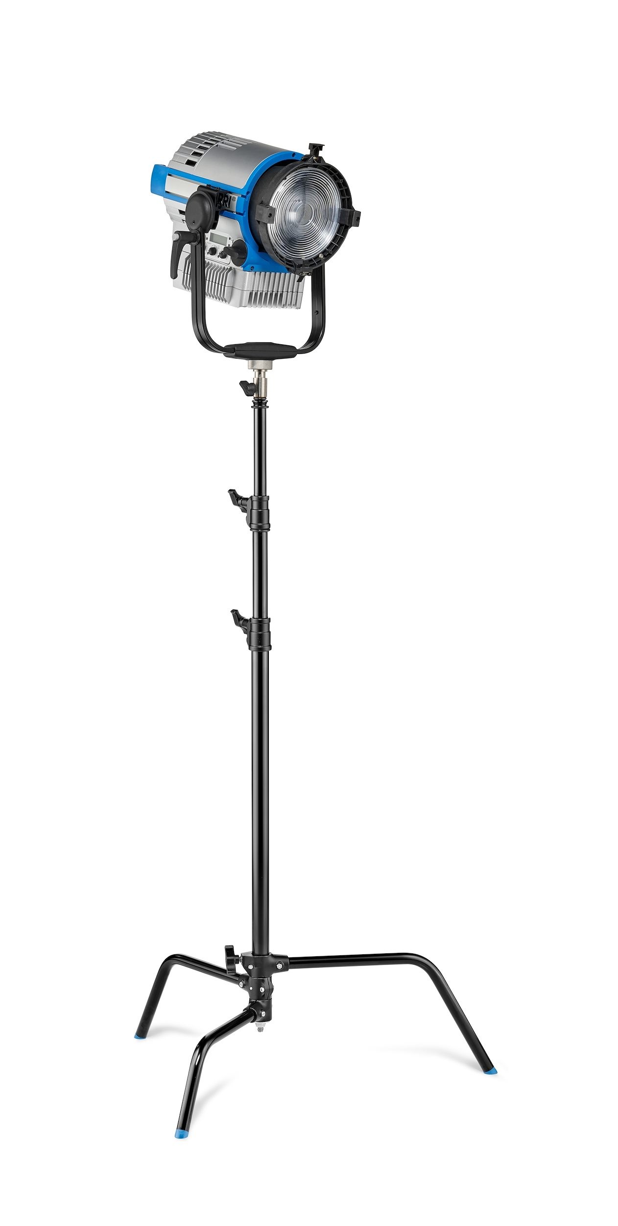 Trípode C-Stand 25 de acero negro con base tortuga fija y pata REGULABLE en altura (o lazy leg); con espárrago 16mm de Avenger. También conocido como trípode Century o Ceferino. Trípode de 3 secciones (2 extensiones). Alturas: máxima 253cm, mínima 110cm, plegado 110cm. Otras medidas: diámetro huella 95cm, capacidad 10kg, peso 5,8kg. Avenger es la marca de referencia en la industria del cine. Este es el trípode menos popular por su tamaño medio y al mismo tiempo más versátil pues permite montarlo en desniveles o escalones sin que pierda su verticalidad; utilizado con brazos y rótulas ceferino para sujetar banderas y hollywoods; también sirve para focos pequeños. *Se recomienda poner sacos de contrapeso en las patas de los trípodes cuando se trabaje con ceferinos y banderas o focos en un extremo.
