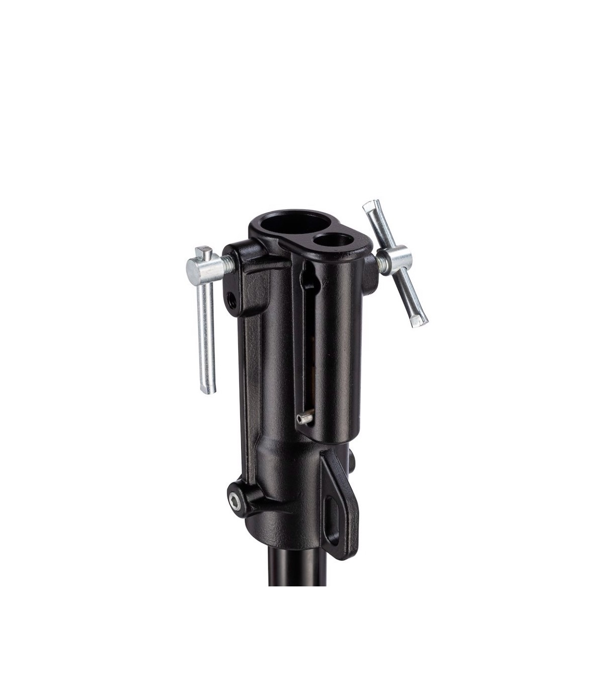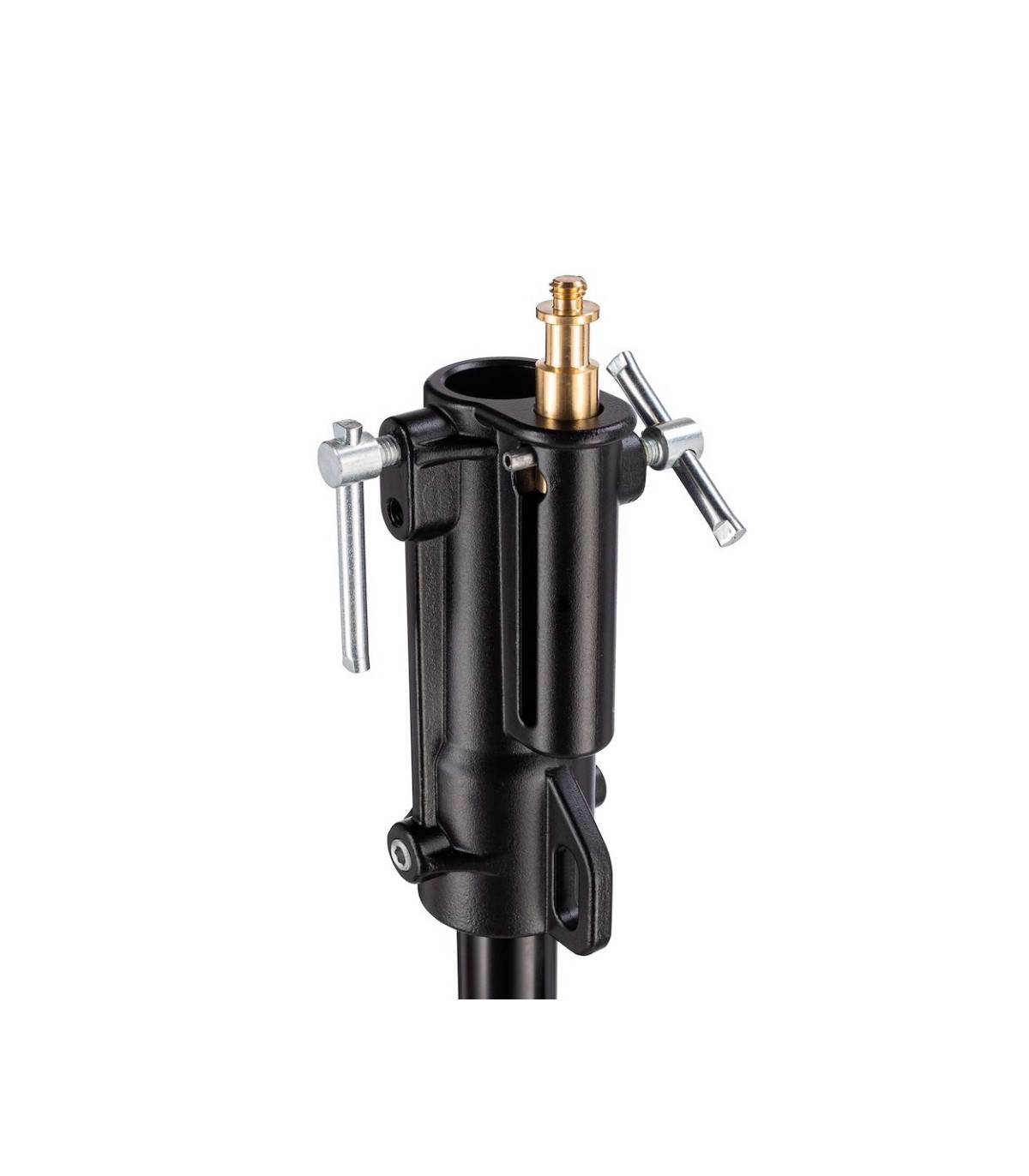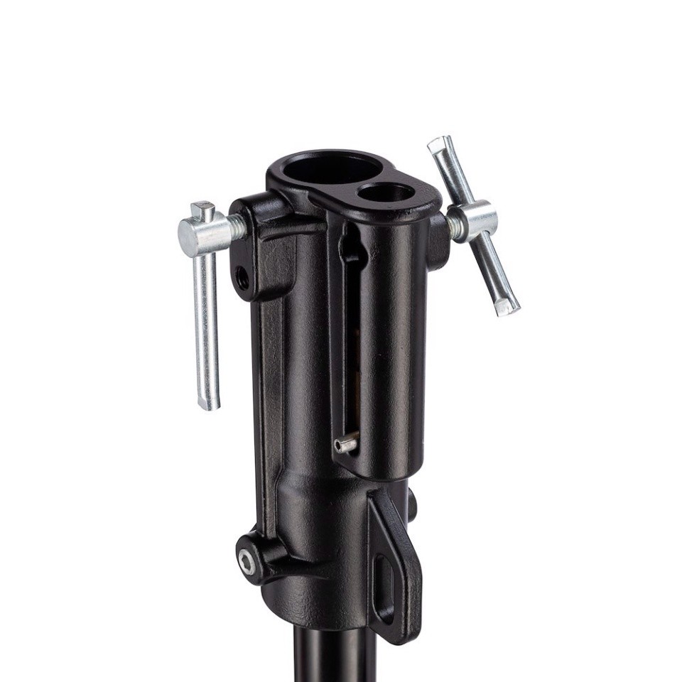 Columna trípode de aluminio negro con cabeza universal (manguito 29mm y espárrago 16mm) arriba y espárrago 29mm abajo. 2 secciones (1 extensión). NO incluye base. Extensible desde 125cm hasta 210cm; peso 2,4kg. Indicado tanto para bases como para extención de otros trípodes.