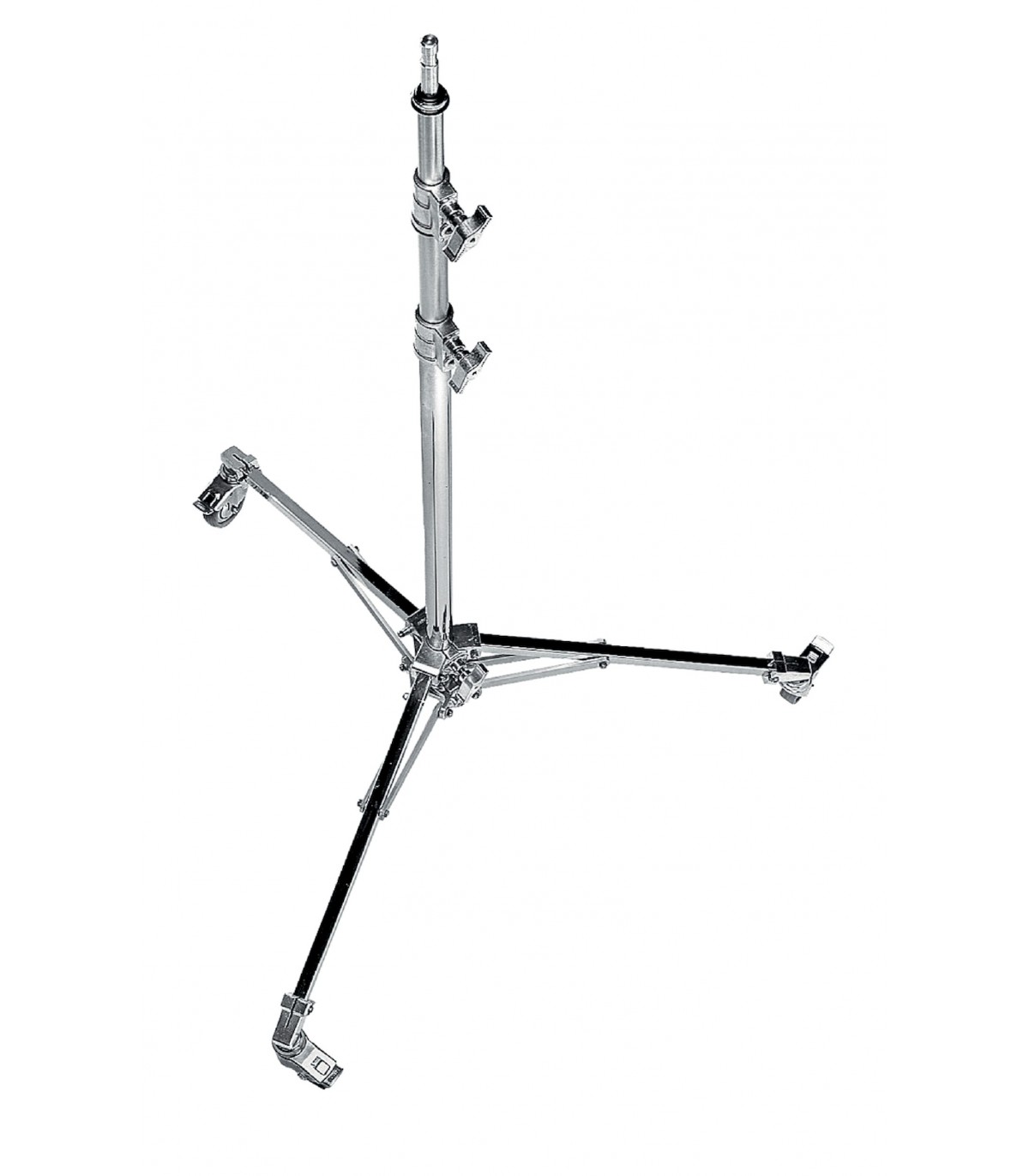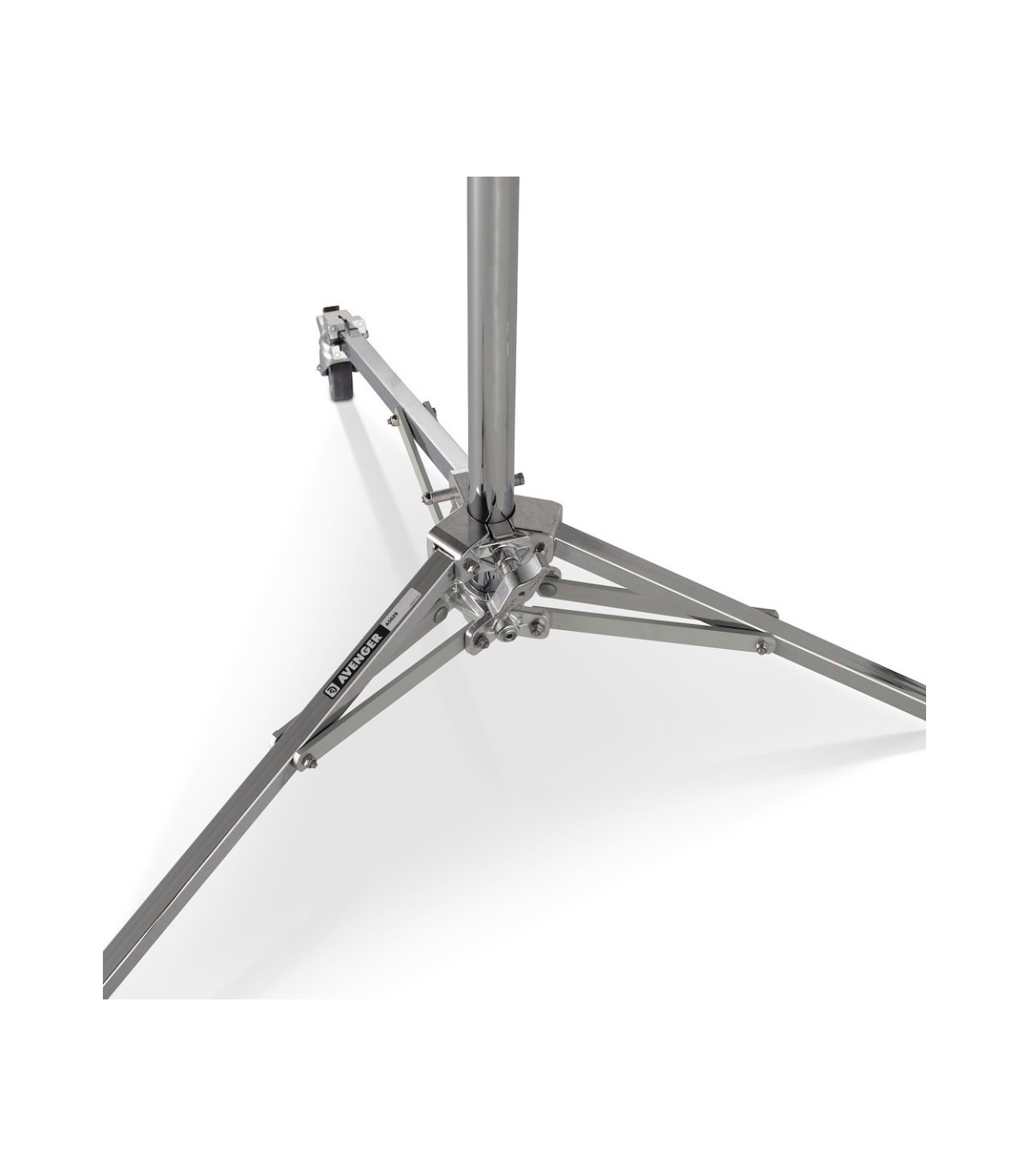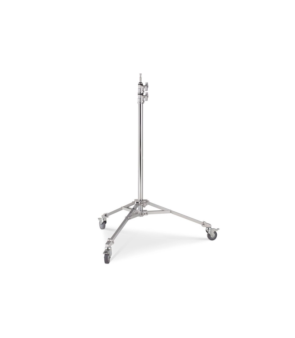 Trípode Roller 29 de acero cromado con espárrago 16mm y patas bajas de Avenger. Trípode de 3 secciones (2 extensiones de aluminio). CON ruedas con freno. Alturas: máxima 290cm, mínima 125cm, plegado 123cm. Otras medidas: diámetro huella 100cm, capacidad 12kg, peso 5,7kg. Avenger es la marca de referencia en la industria del cine. Este es el trípode medio de plató utilizado para focos o paneles medianos y grandes.