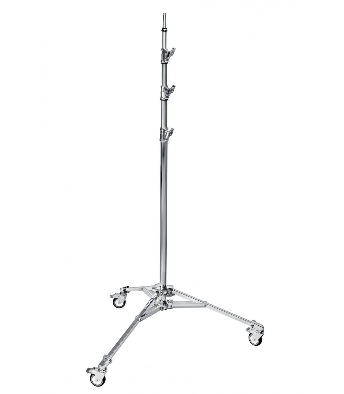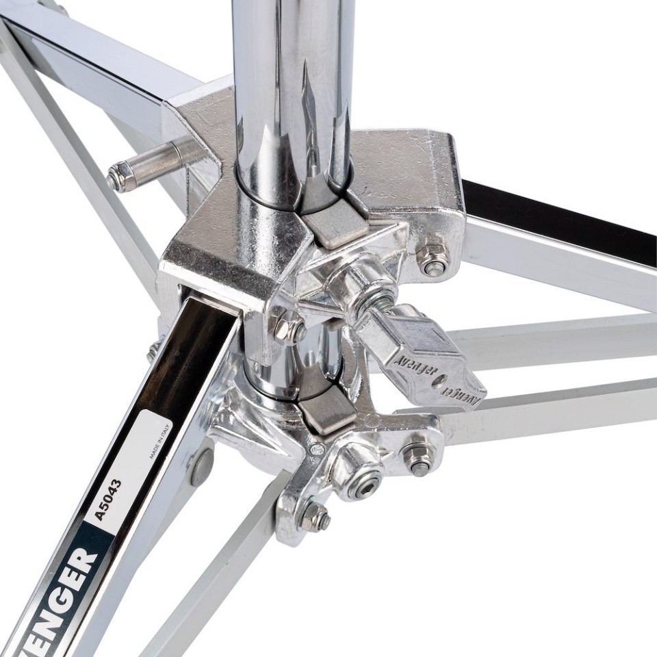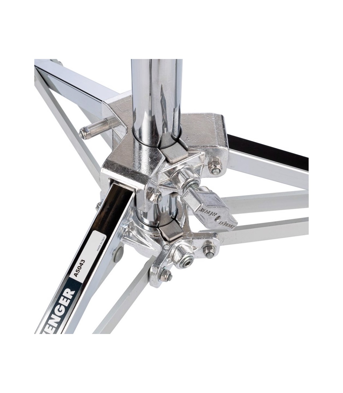 Trípode Roller 43 de acero cromado con espárrago 16mm y patas bajas de Avenger. Trípode de 4 secciones (3 extensiones de aluminio). CON ruedas con freno. Alturas: máxima 430cm, mínima 146cm, plegado 135cm. Otras medidas: diámetro huella 106cm, capacidad 12kg, peso 6,3kg. Avenger es la marca de referencia en la industria del cine. Este es el trípode alto de plató utilizado para focos o paneles medianos y grandes.