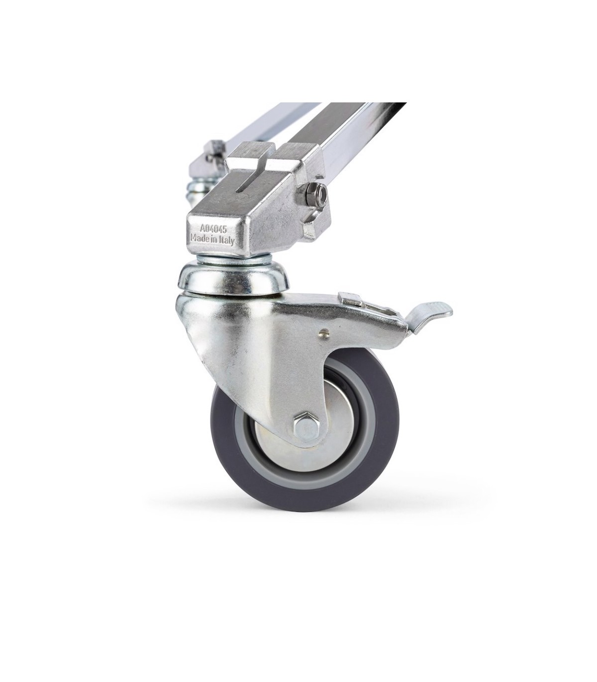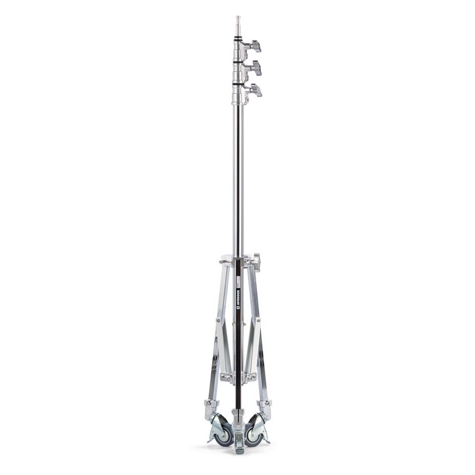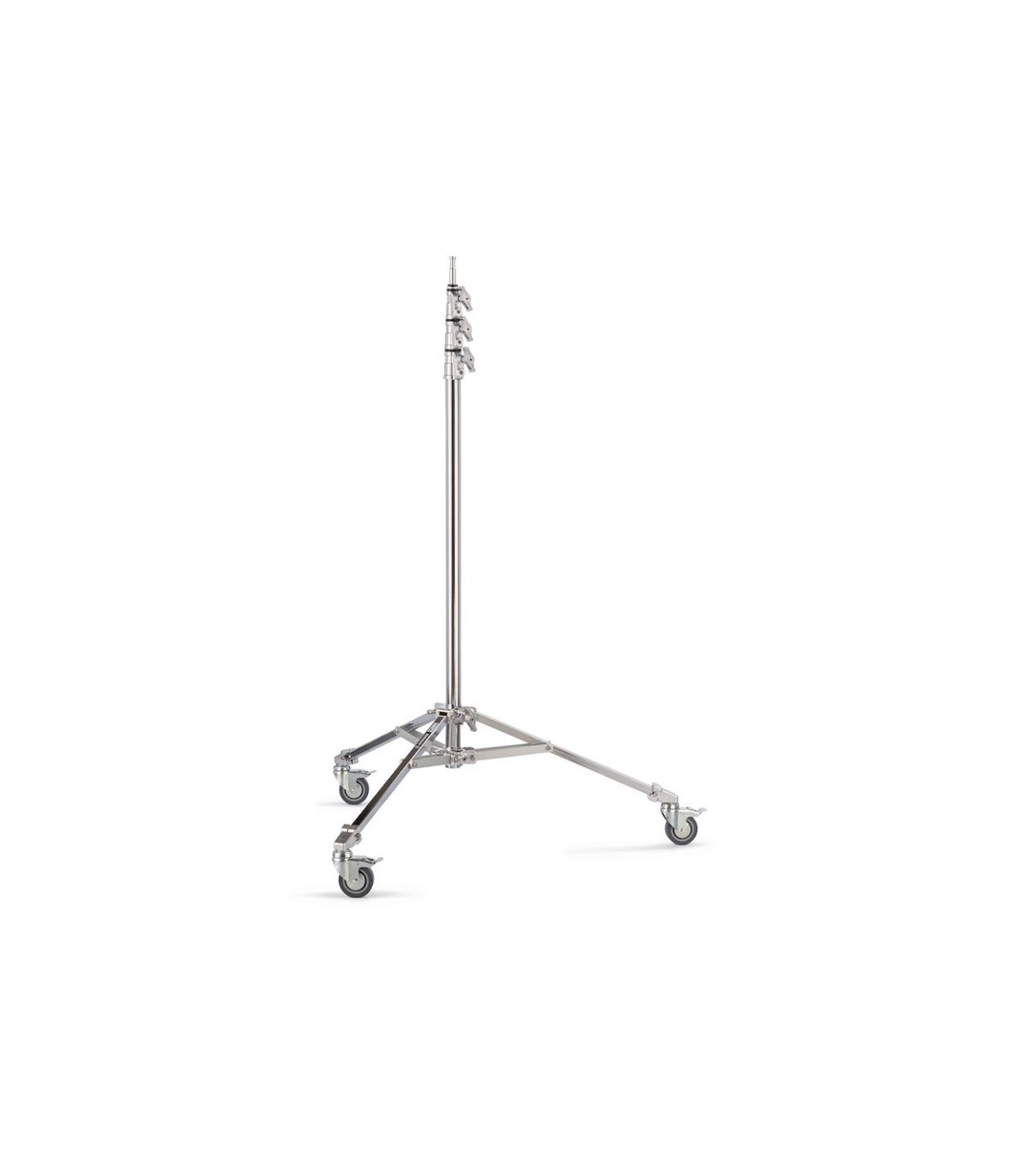 Trípode Roller 43 de acero cromado con espárrago 16mm y patas bajas de Avenger. Trípode de 4 secciones (3 extensiones de aluminio). CON ruedas con freno. Alturas: máxima 430cm, mínima 146cm, plegado 135cm. Otras medidas: diámetro huella 106cm, capacidad 12kg, peso 6,3kg. Avenger es la marca de referencia en la industria del cine. Este es el trípode alto de plató utilizado para focos o paneles medianos y grandes.