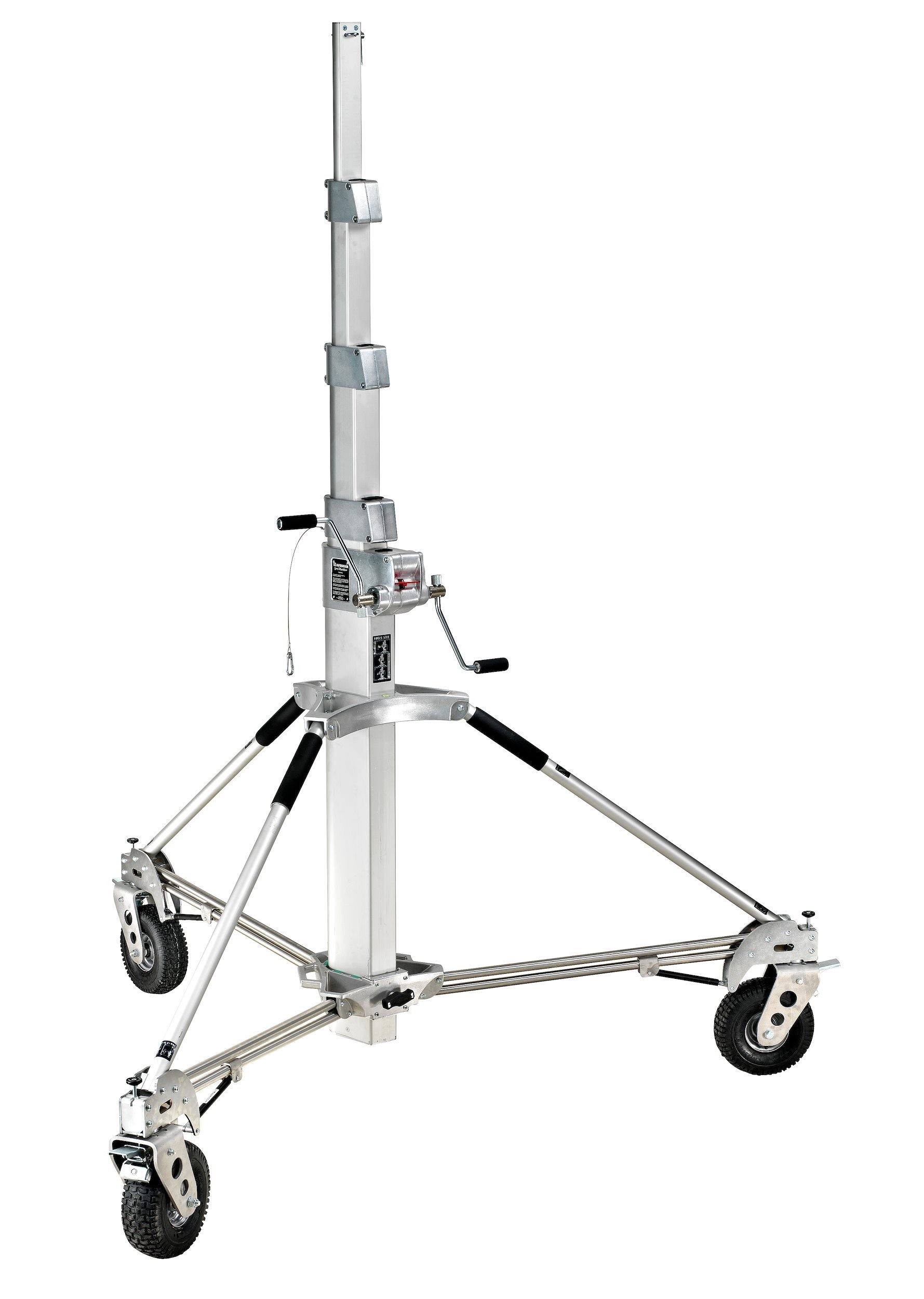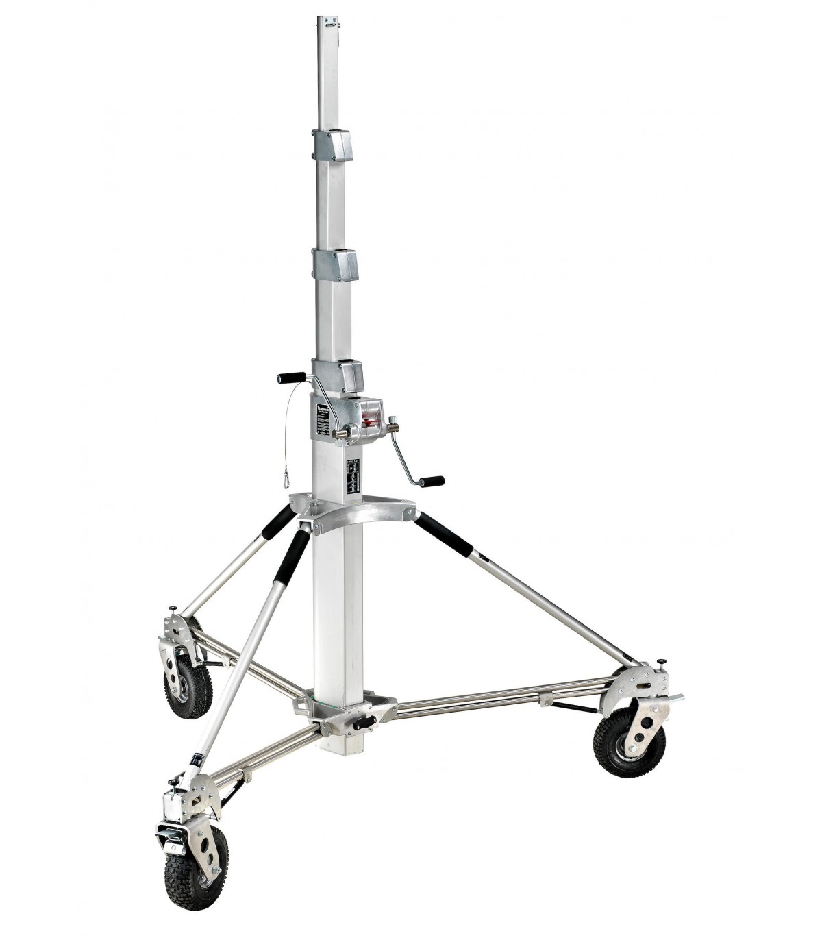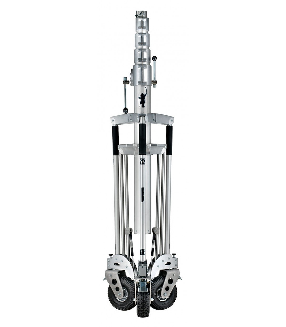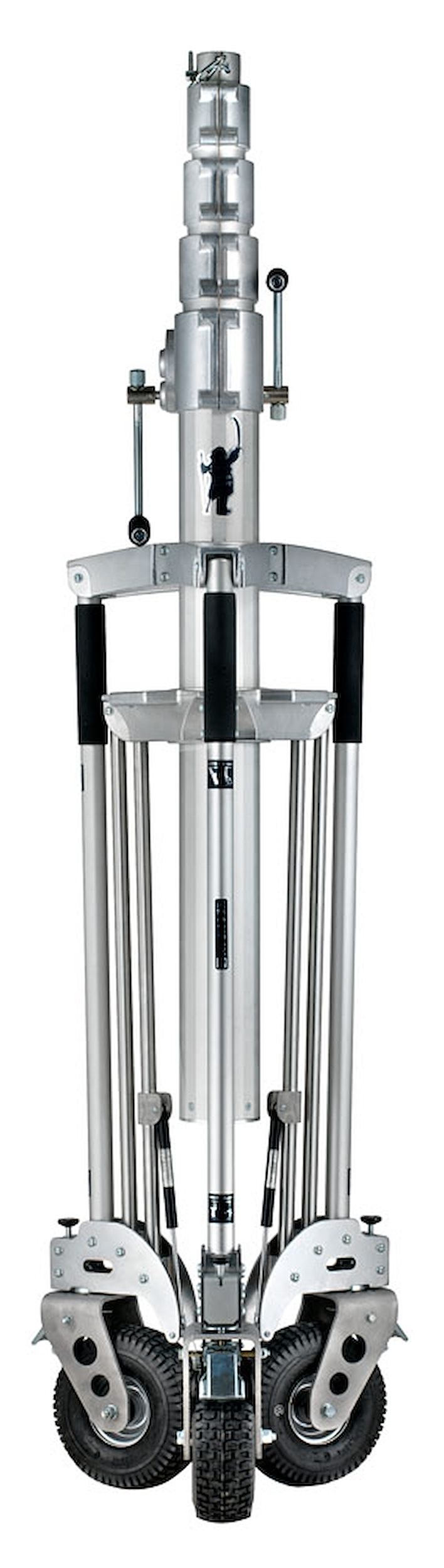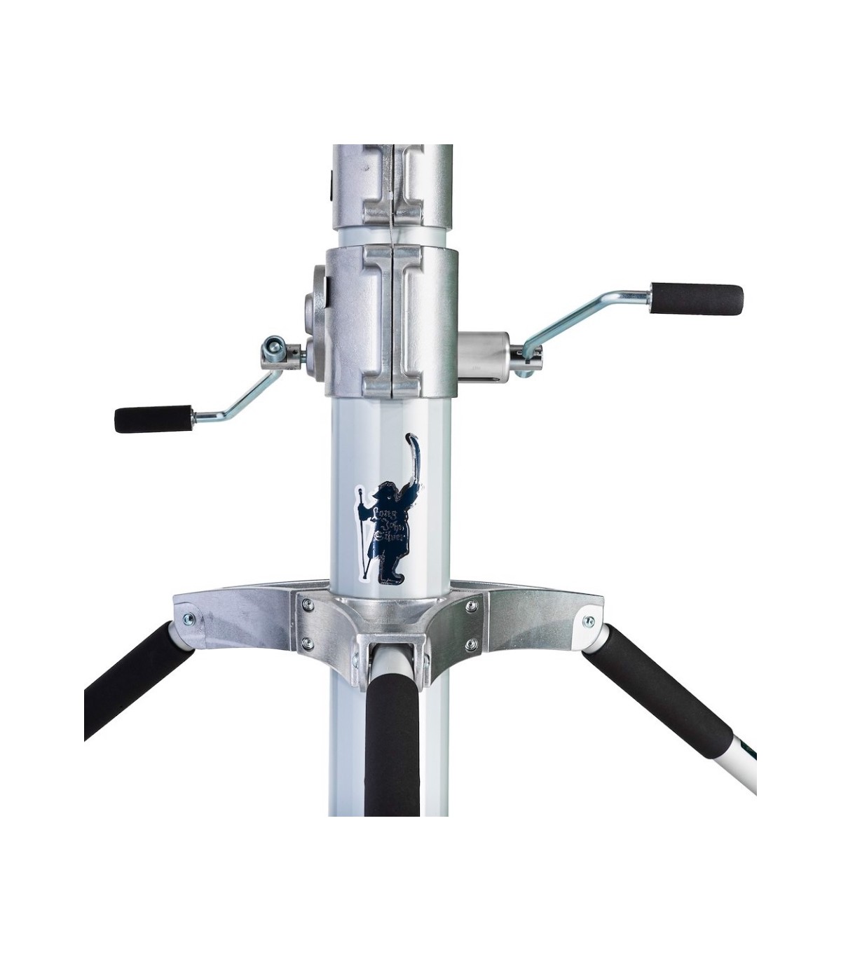 Trípode Long John Silver 570cm cremallera de acero cromado, con manguito 29mm, de Avenger. También conocido como trípode Pirata grande. Trípode de 5 secciones (4 extensiones). CON ruedas foam con freno. Alturas: máxima 570cm, mínima 177cm, plegado 224cm. Otras medidas: diámetro huella 240cm, capacidad 120kg, peso 85kg. Es el mayor de los trípodes con una capacidad de carga de 120kg. Indicado para exteriores con proyectores muy muy pesados.