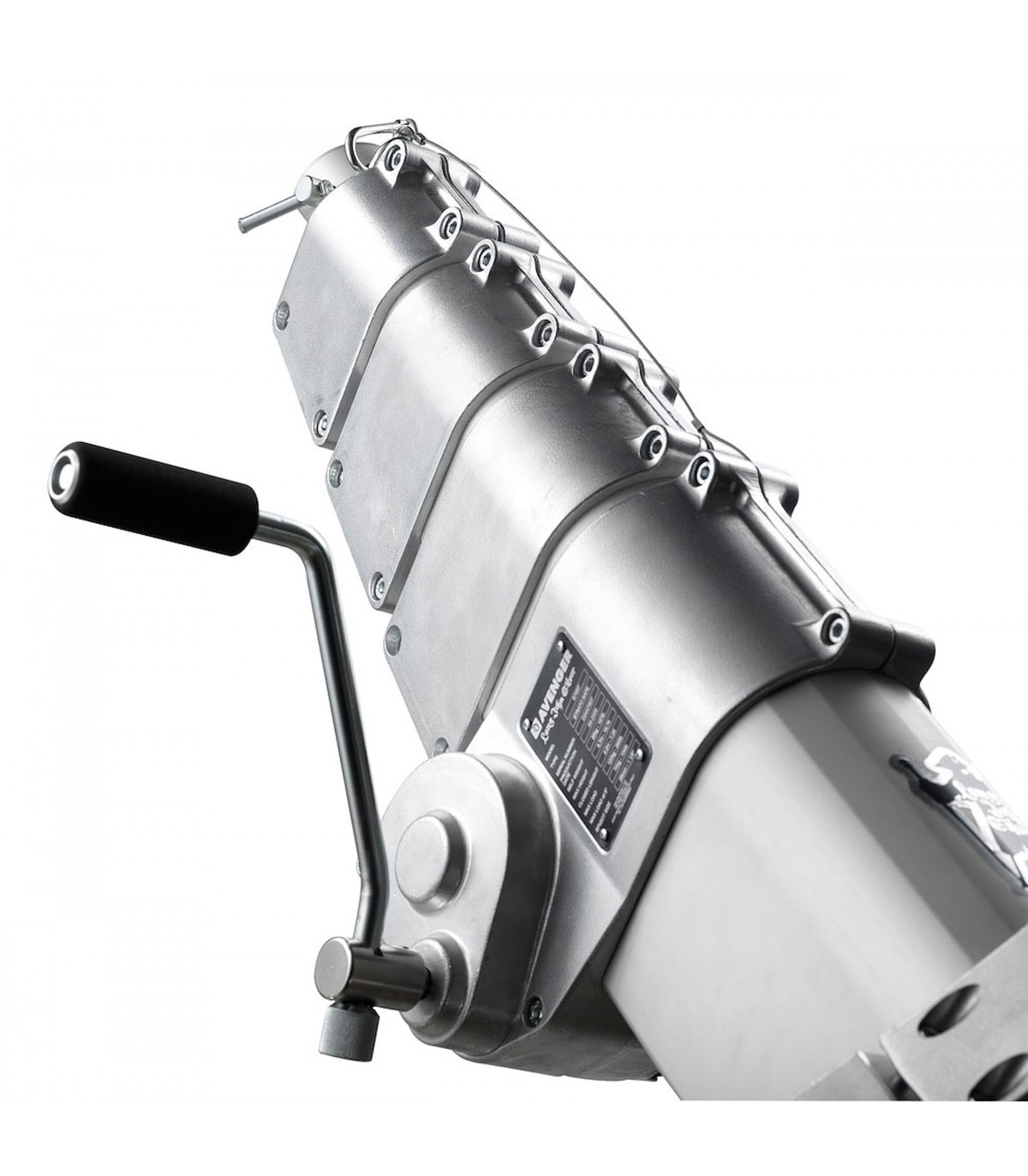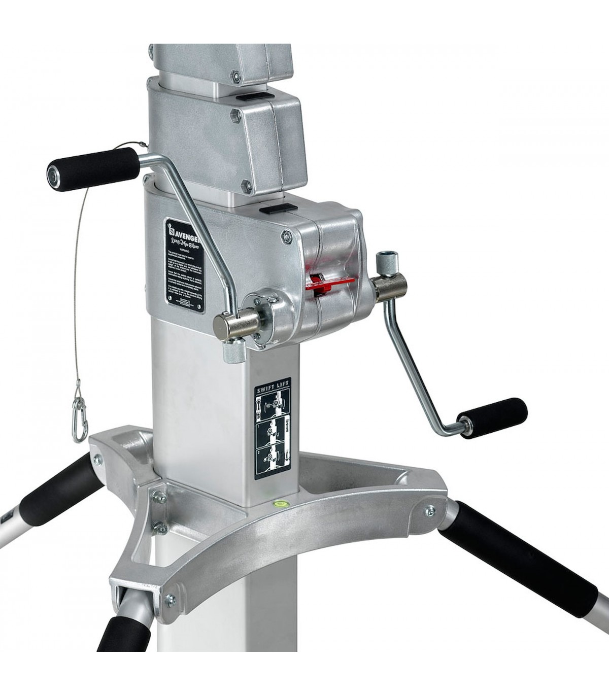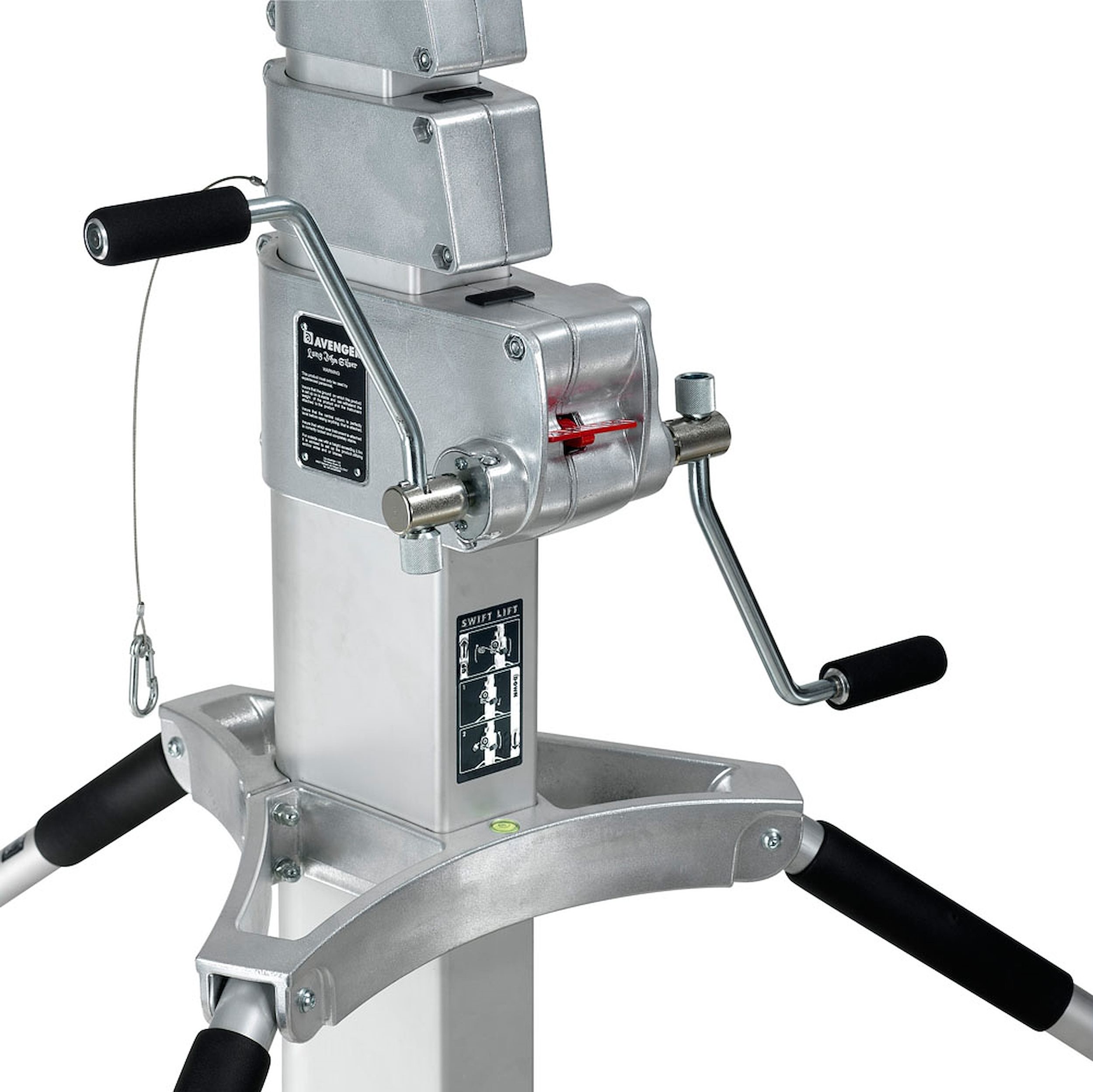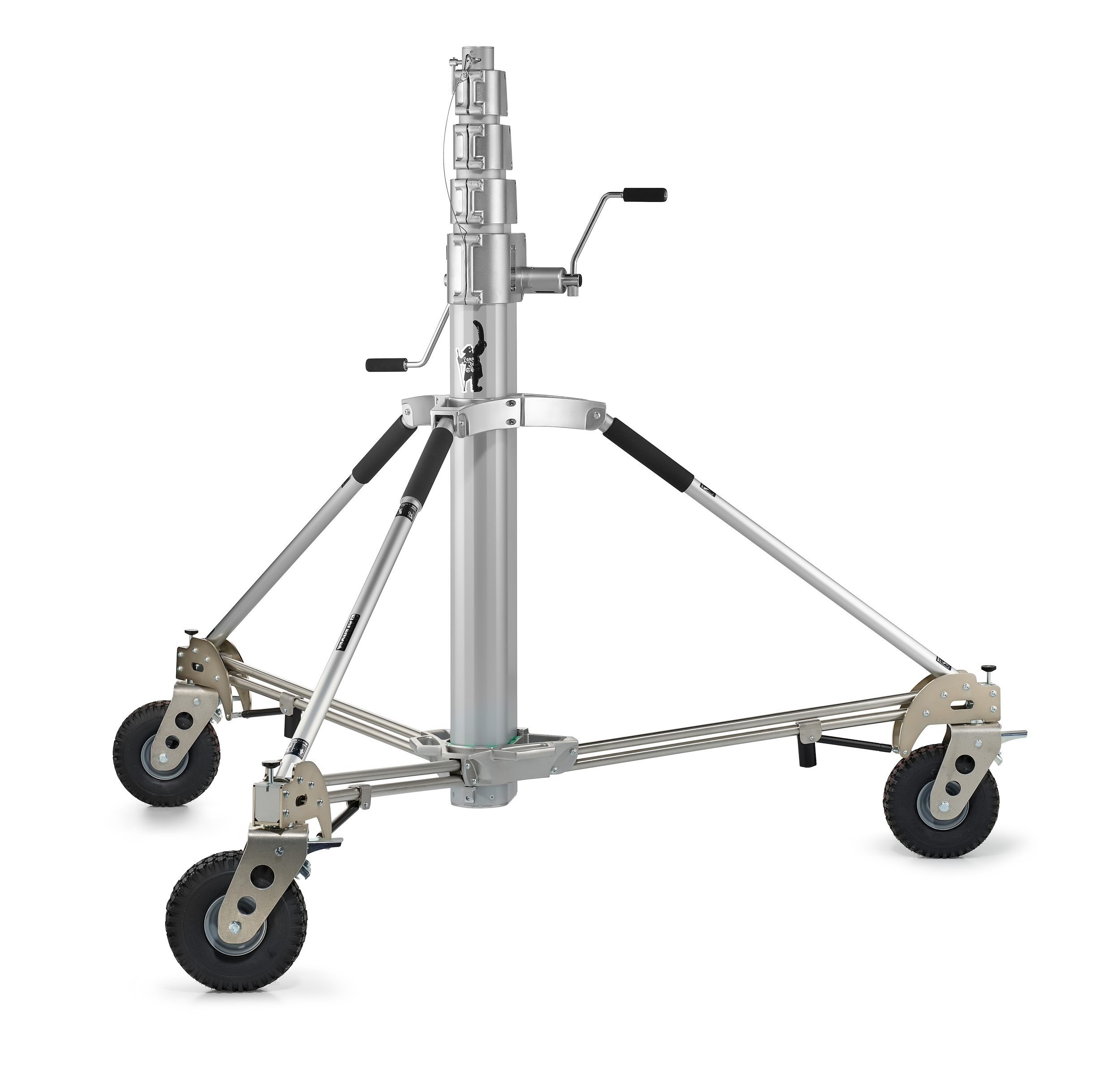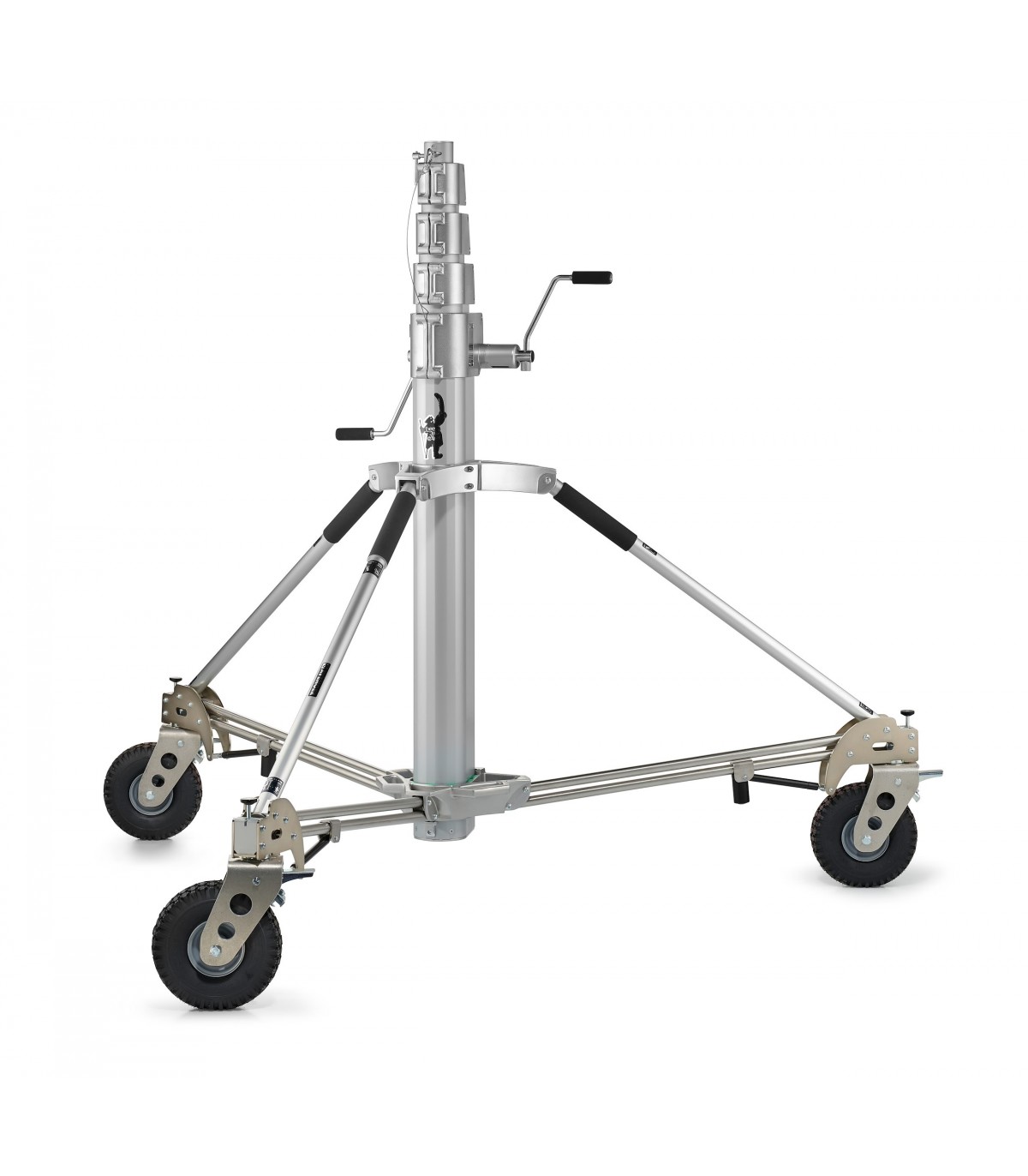 Trípode Long John Silver 570cm cremallera de acero cromado, con manguito 29mm, de Avenger. También conocido como trípode Pirata grande. Trípode de 5 secciones (4 extensiones). CON ruedas foam con freno. Alturas: máxima 570cm, mínima 177cm, plegado 224cm. Otras medidas: diámetro huella 240cm, capacidad 120kg, peso 85kg. Es el mayor de los trípodes con una capacidad de carga de 120kg. Indicado para exteriores con proyectores muy muy pesados.
