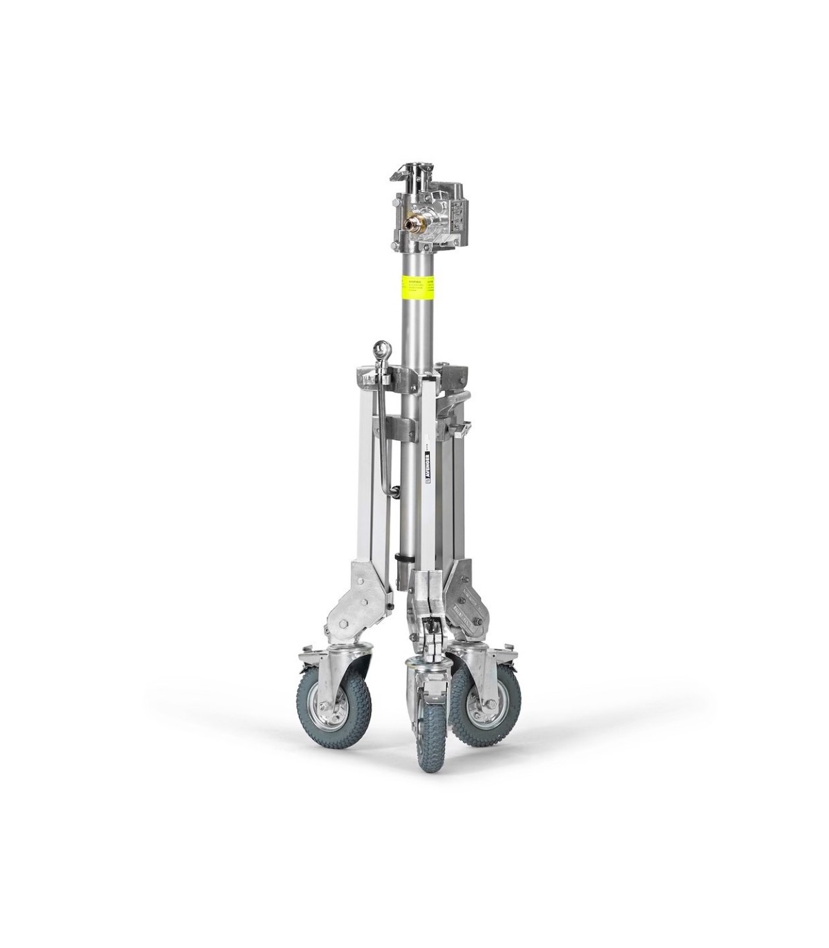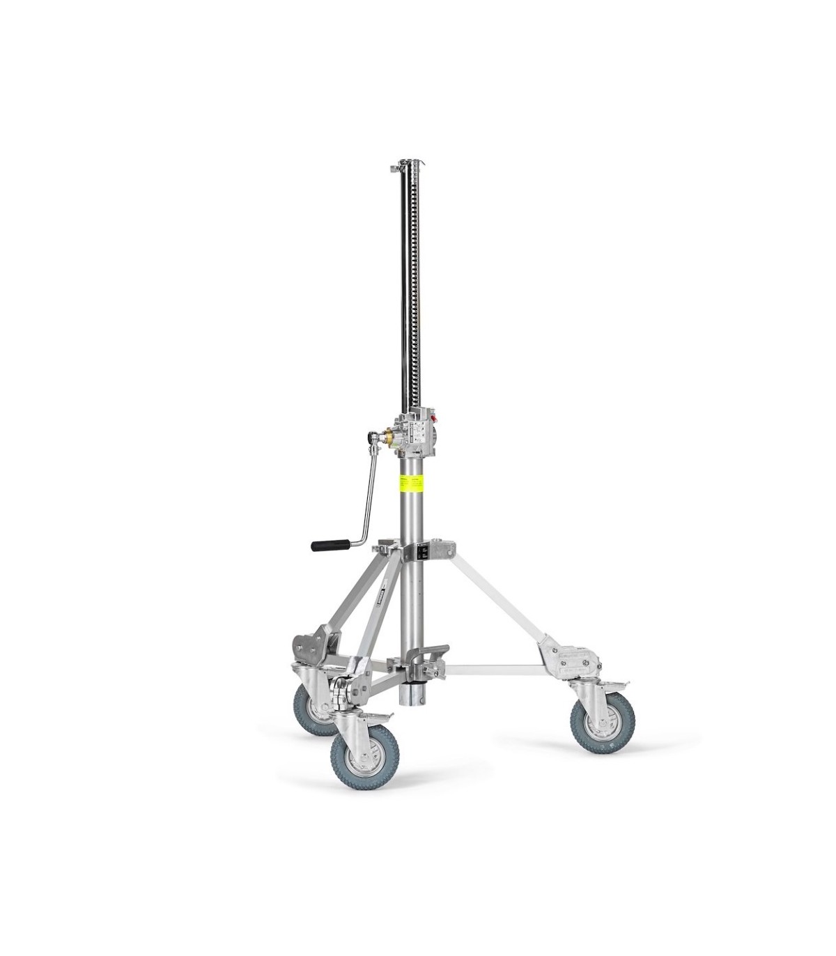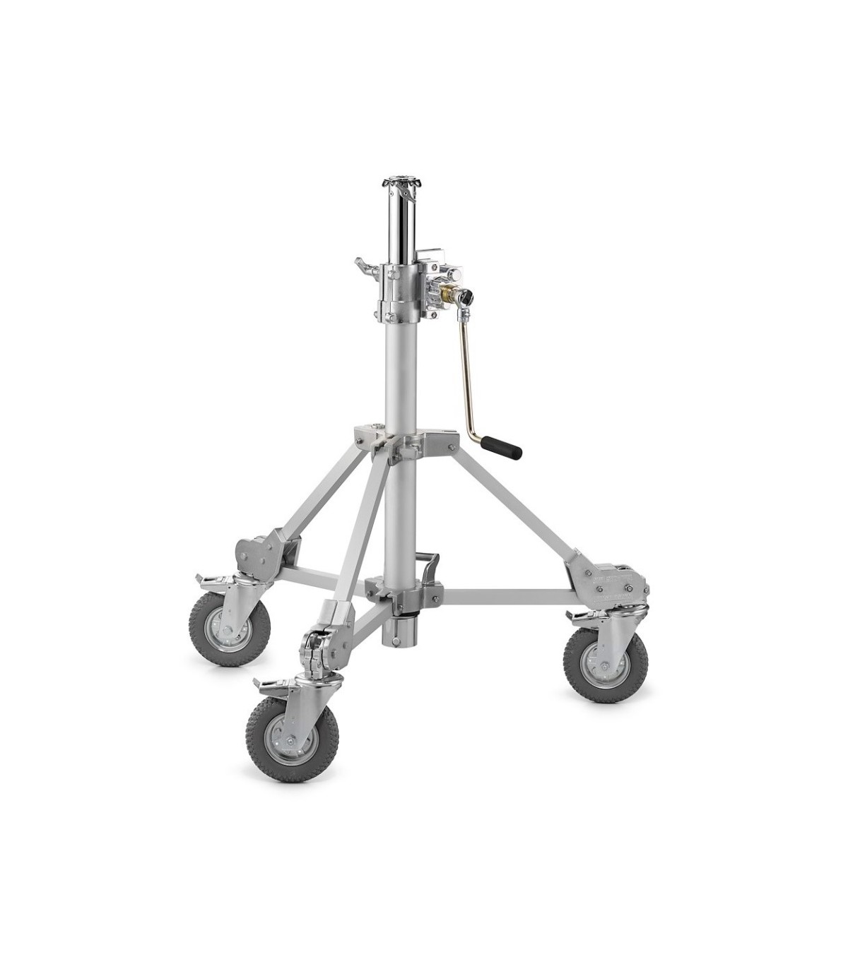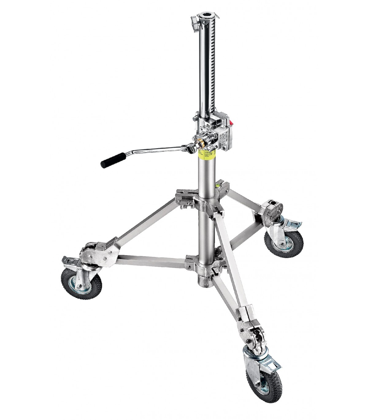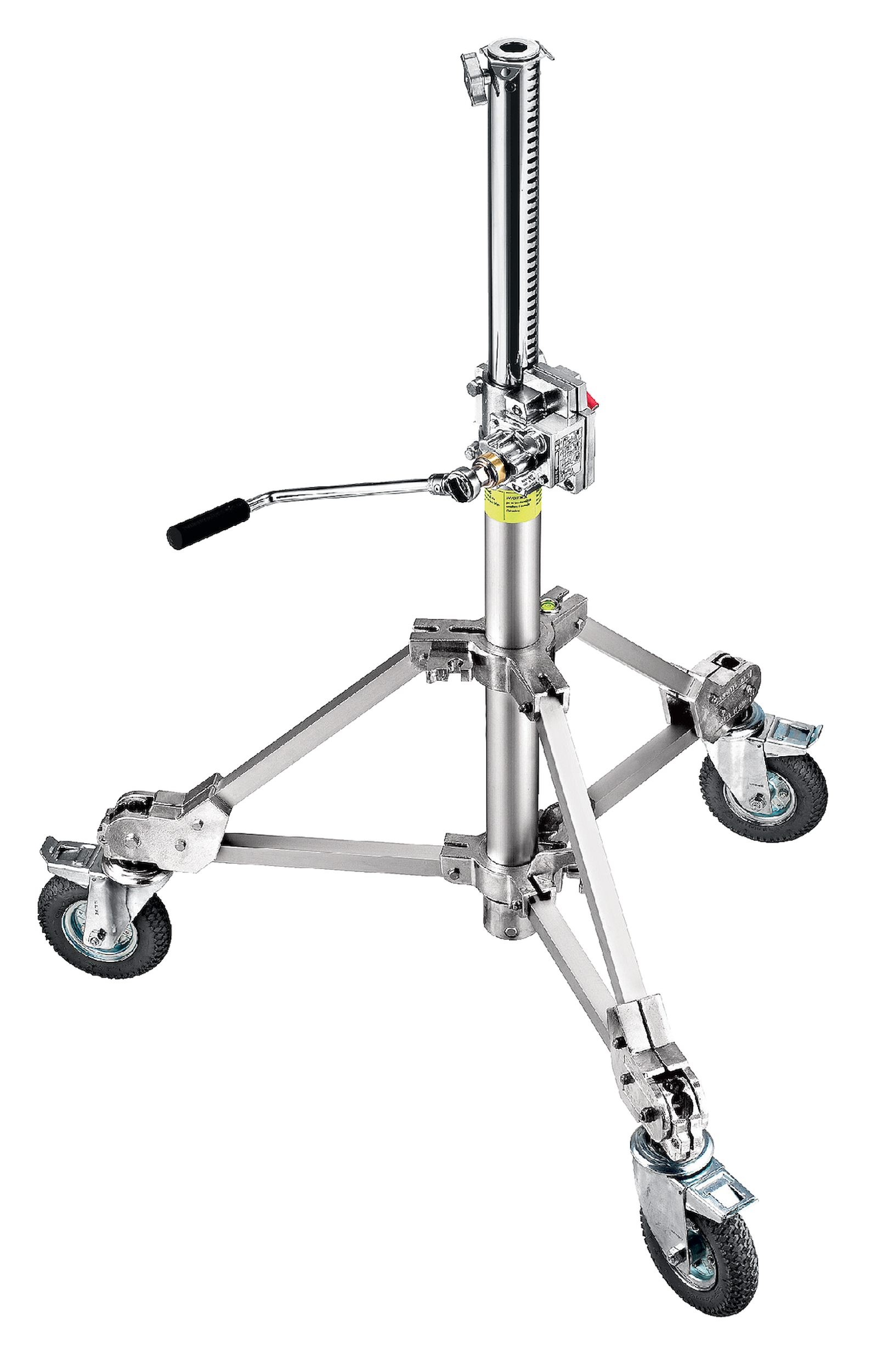 Trípode Strato Safe 18 cremallera de acero cromado, con manguito 29mm, de Avenger. Trípode de 2 secciones (1 extensión). CON ruedas foam con freno. Alturas: máxima 175cm, mínima 105cm, plegado 126cm. Otras medidas: diámetro huella 120cm, capacidad 100kg, peso 27kg. El trípode de carraca más bajo y de excelente carga indicado para estudios o exteriores con proyectores de peso muy alto.