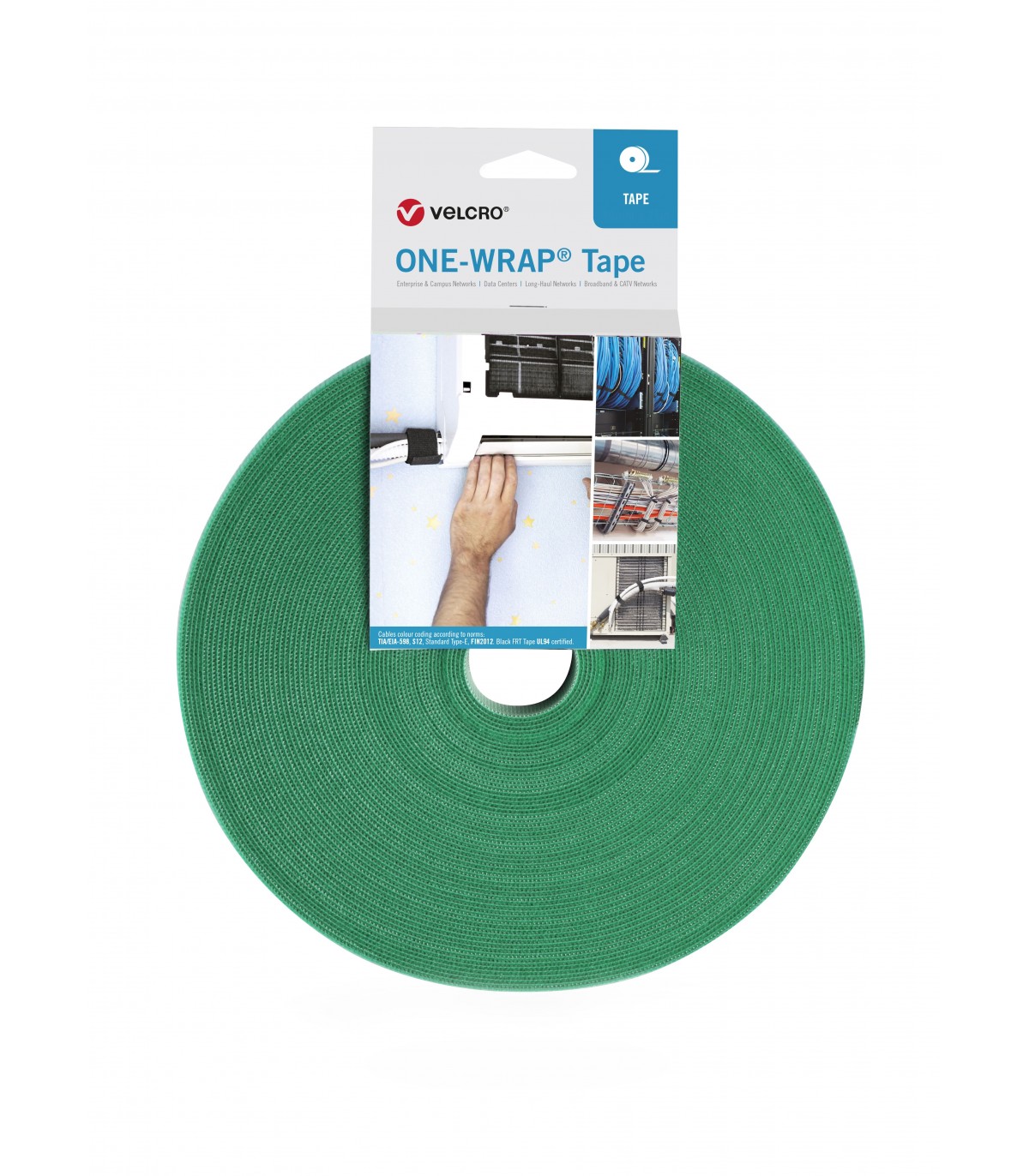 Cinta verde ONE-WRAP® con cierre de gancho medio, marca VELCRO®; ancho 2cm; rollo de 25m; perfil medio; ciclo de vida 100 usos. Servida en colgador. La cinta Velcro es a dos caras y suave para no dañar los cables. Indicada para sujetar y encintar cables de cualquier tipo.