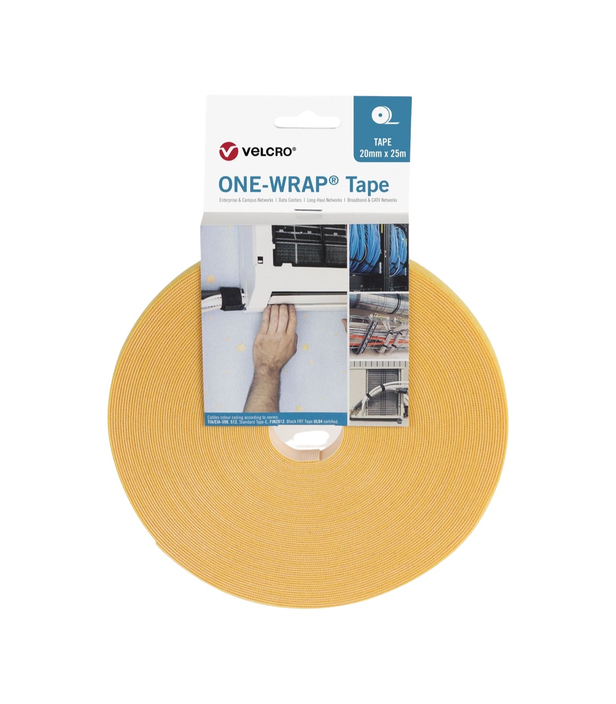 Cinta amarilla ONE-WRAP® con cierre de gancho medio, marca VELCRO®; ancho 2cm; rollo de 25m; perfil medio; ciclo de vida 100 usos. Servida en colgador. La cinta Velcro es a dos caras y suave para no dañar los cables. Indicada para sujetar y encintar cables de cualquier tipo.