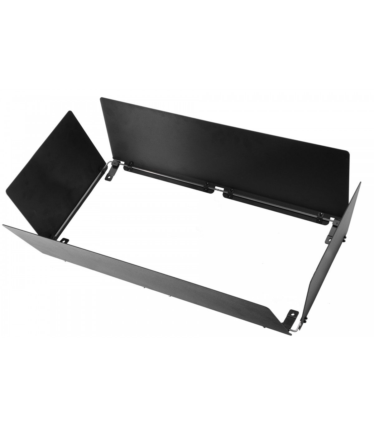 Visera 4 hojas para el Power 2. También son válidas para el Light2, pero en este caso recomendamos un eggcrate para recortar la luz. Las viseras de chapa de acero pintadas en epoxi negro mate sirven para recortar el haz y evitar luz parásita fuera del campo donde queremos iluminar.